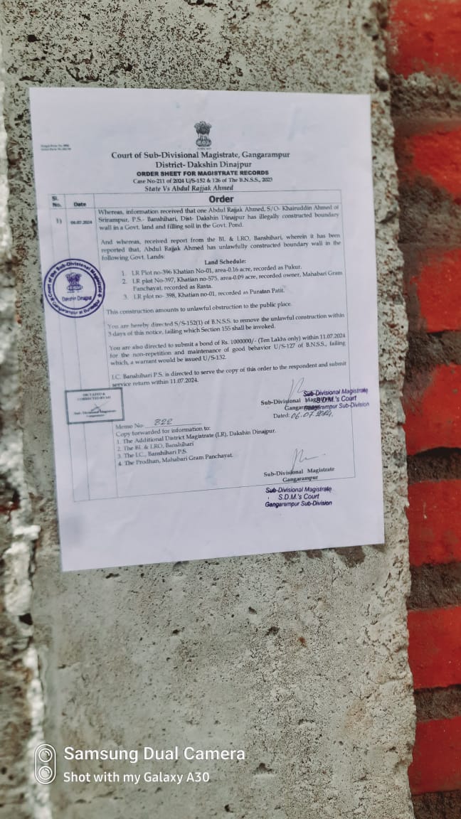 এ বিষয়ে বি এল এন্ড এল আর ও দপ্তরের আধিকারিক মলয় চক্রবর্তী জানিয়েছেন অভিযোগের ভিত্তিতে আমরা মাহাবাড়ি অঞ্চলের শ্রীরামপুর এলাকায় পৌঁছেছিলাম। মহকুমা শাসকের পক্ষ থেকে অভিযুক্ত কে আইনি নোটিশ দেওয়া হয়েছে। অভিযুক্তর বিরুদ্ধে দোষ প্রমাণিত হলে আইনত ব্যবস্থা নেওয়া হবে।