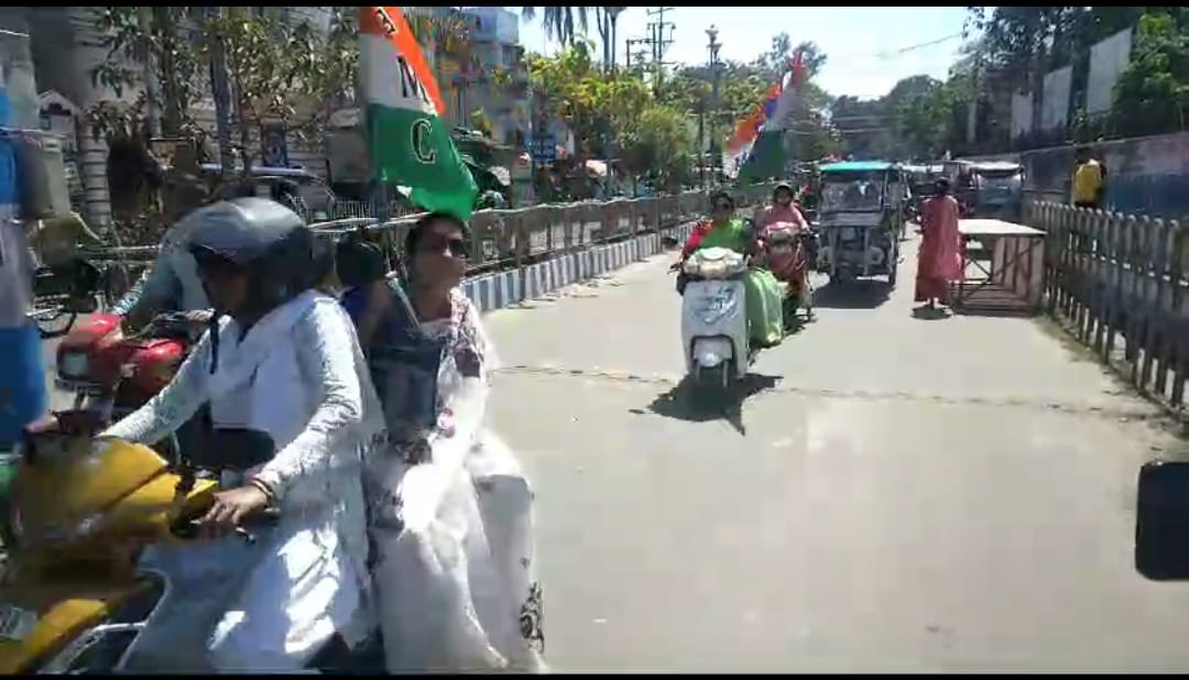 জনগর্জন সভার প্রচারে বালুরঘাটে স্কুটি র‍্যালি মহিলা তৃণমূলের। হিলি মোড় থেকে শুরু হওয়া র‍্যালিটি শেষ হয় শহরের থানা মোড় এলাকায়