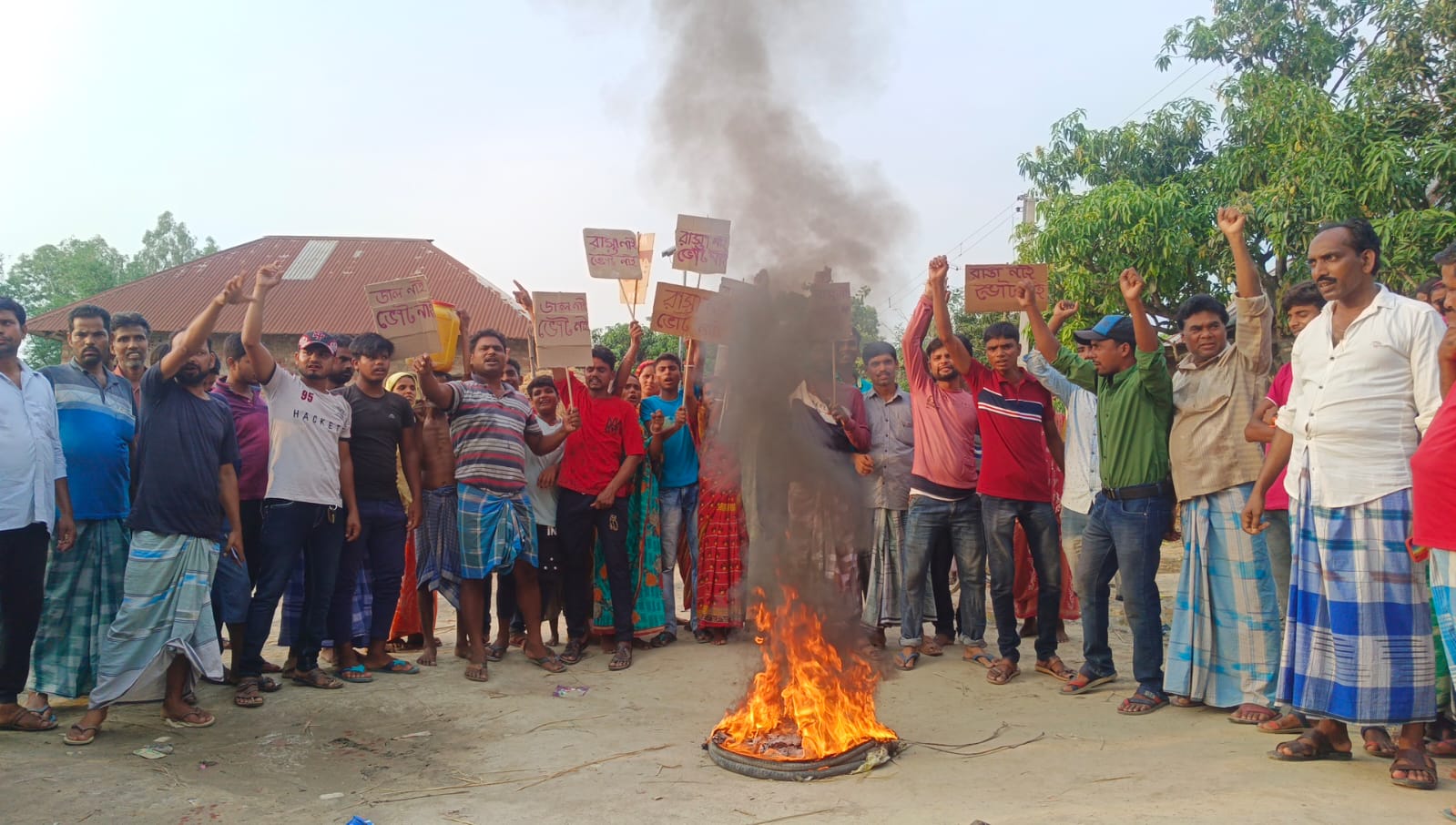 গ্রামে ঢোকার মূল রাস্তা বেহাল।সংস্কারের দাবিতে সরব বাসিন্দারা।ভোট আসে ভোট যায়,প্রতিশ্রুতির পর প্রতিশ্রুতি এলেও আজও সেখানে রাস্তা নির্মাণ হয়নি।স্বাধীনতার ৭৬ বছর কেটে গেলেও এলাকায় হয়নি তেমন বিশেষ উন্নয়ন।দীর্ঘ ২৫ বছর ধরে রাস্তার বেহাল দশায় ভুক্তভোগী এলাকার মানুষজন।গ্রামে নেই কোনো পরিশ্রুত পানীয় জলের ব্যবস্থা।স্থানীয় জনপ্রতিনিধিদের বারবার জানিয়েও কোনো লাভ হয়নি।হেলদোল নেই প্রশাসনেরও।সম্প্রতি চালু হওয়া‘পথশ্রী’প্রকল্পেও তাঁদের ভাগ্যে শিকে ছেঁড়েনি।অবশেষে রাস্তায় টায়ার জ্বালিয়ে বিক্ষোভ দেখালেন গ্রামবাসীরা।প্রতিবাদে ভোট বয়কটের ডাক দিলেন মালদা জেলার হরিশ্চন্দ্রপুর-১ নং ব্লকের রশিদাবাদ গ্রাম পঞ্চায়েতের রনিয়াবাড়ি বাসিন্দাদের একাংশ।বুধবার সকাল ১০ টা নাগাদ স্থানীয় মহিলা-পুরুষরা হাতে প্ল্যাকার্ড নিয়ে বিক্ষোভে সামিল হন।’রাস্তা নেই ভোট নেই,জল নেই ভোট নেই’শ্লোগান দিতে থাকেন তাঁরা।গ্রামবাসীদের অভিযোগ,দীর্ঘ বছর ধরে এলাকার রাস্তা বেহাল হয়ে পড়ে আছে।এই এলাকায় প্রায় তিন হাজার লোকের বসবাস।