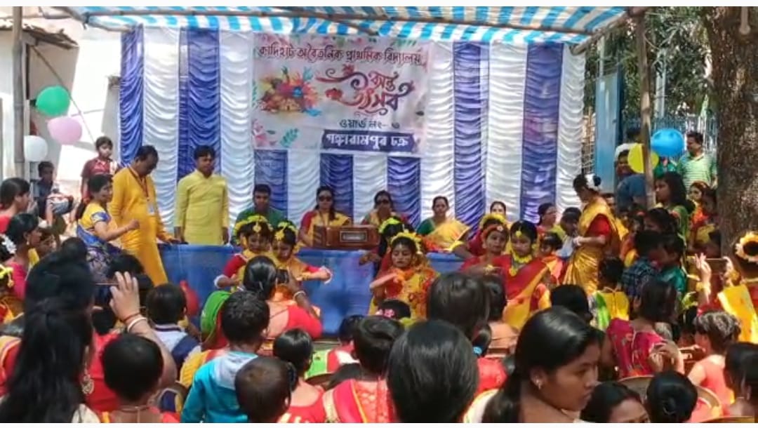 বসন্ত উৎসবে মাতলেন গঙ্গারামপুর শহরের কাদিহাট অবৈতনিক প্রাথমিক বিদ্যালয়ের খুদে পড়ুয়ারা। তাদের সঙ্গে তাল মেলালেন এলাকার অভিভাবকরাও।