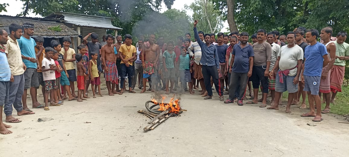 বালুরঘাট ৭ আগস্ট দক্ষিণ দিনাজপুর ————————–বেহাল রাস্তা সংস্কার করার দাবিতে টায়ার জ্বালিয়ে পথ অবরোধ করল গ্রামবাসীরা। বৃহস্পতিবার দুপুরে দক্ষিণ দিনাজপুর জেলা তপন থানার নয়াবাজার করদহ রাস্তার জিগাতলী মোড়ে টায়ার জ্বালিয়ে বিক্ষোভ দেখান তপন ব্লকের ২নং আজমতপুর কসবা জগতলী ও বাশুড়িয়া ডাঙ্গাপাড়া এলাকার গ্রামবাসী।তাদের অভিযোগ ,স্থানীয় গ্রাম পঞ্চায়েত ও ব্লক প্রশাসনে জানিয়ে কোন কাজ না হয় এমন সিদ্ধান্ত নিতে হয়েছে।প্রধান ও ভিডিও বিষয়টি খোঁজ নিয়ে দেখে সমস্যা সমাধানে আশ্বাস দিয়েছেন। তপন ব্লকের আজমতপুর গ্রাম পঞ্চায়েতের জিগাতলী,বাসুরিয়া এলাকার দু কিলোমিটার বেহাল রাস্তা দিয়ে বহু মানুষজন চলাচল করে থাকে।এলাকার আশপাশে রয়েছে অঙ্গনাওয়ারী সেন্টার স্বাস্থ্যকেন্দ্র থেকে শুরু করে সমস্ত কিছুই। গর্ভাবস্থায় মহিলাদেরকে হাসপাতালে নিয়ে যেতে সমস্যায় পড়তে হয় এলাকাবাসীদের। ওই রাস্তা দিয়ে চলাচল করা গ্রামবাসী সান্তনা মালাকার, হিমালয় রায়, কল্যাণ চন্দ্র দাসের অভিযোগ করে বলেন,”বেহাল রাস্তা নিয়ে সমস্যার কারণে এমন আন্দোলন করতে বাধ্য হয়েছে আমরা চাই রাস্তা হোক।” আজমতপুর গ্রাম পঞ্চায়েতের প্রধান রামপ্রসাদ রায় জানিয়েছে,”অবশ্যই সমস্যার সমাধান করার চেষ্টা করা হবে।” তপন ব্লকের বিডিও তীর্থঙ্কর জানিয়েছেন,”বিষয়টি প্রতিটি দিকে দ্রুত ব্যবস্থা না হবে।”