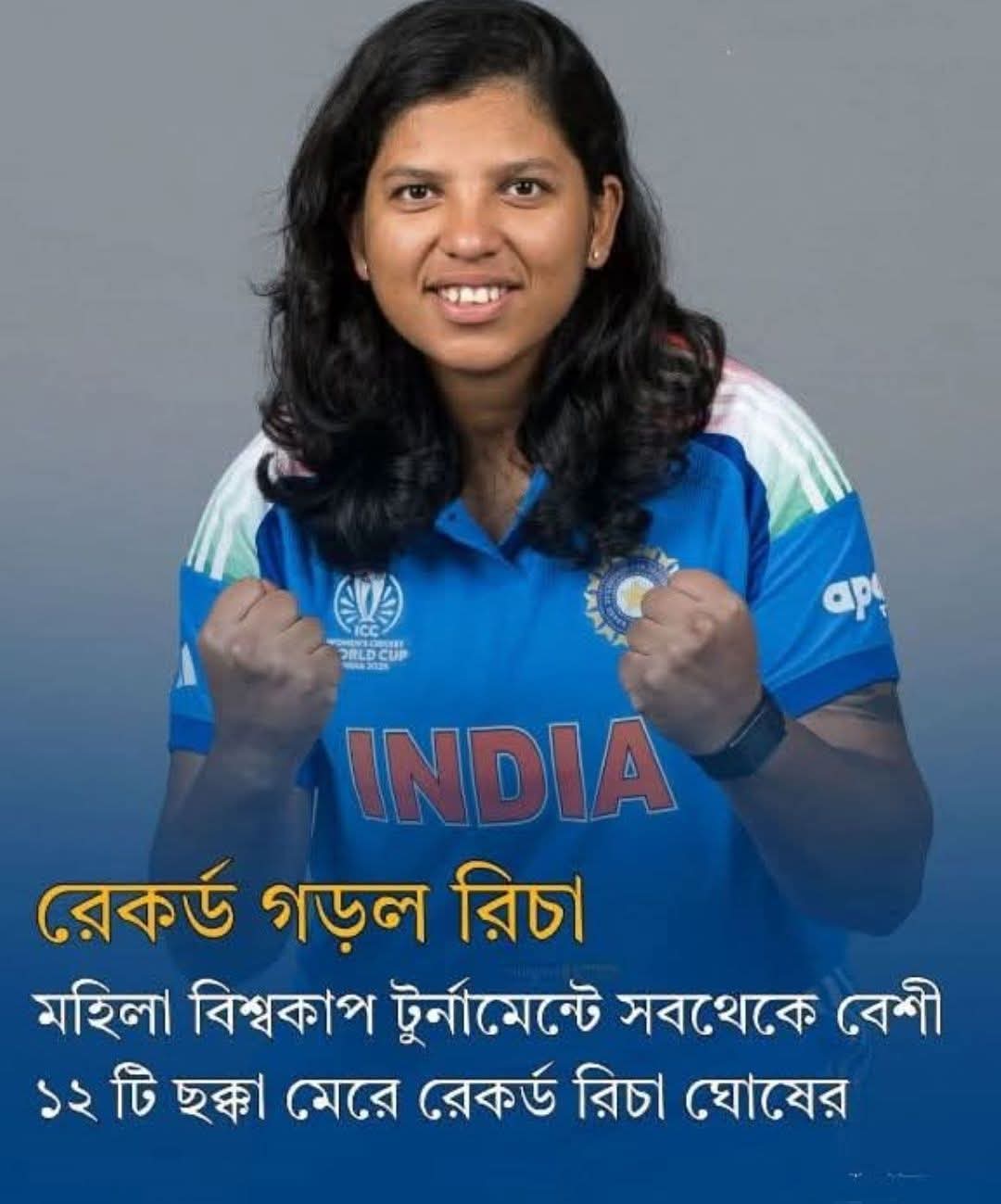 বালুরঘাট, ৩ নভেম্বর –—— বিশ্ব ক্রিকেটে ভারতীয় মহিলা দলের গর্বের নাম এখন রিচা ঘোষ। দক্ষিণ দিনাজপুরের গঙ্গারামপুরের মেয়ে রিচার ঝড়ো ইনিংস আর দুরন্ত উইকেটকিপিংয়ে যেন নতুন ইতিহাস রচনা হলো রবিবারের মুম্বইয়ের মাঠে। তাঁর ২৪ বলে ৩৪ রানের ঝড়ো ইনিংস, দুটি ছয় ও তিনটি চারের ঝলক যেন মুহূর্তে আলো ছড়াল গোটা দেশজুড়ে। আর সেই আলোর প্রতিফলন সবচেয়ে উজ্জ্বল গঙ্গারামপুরের বেলবাড়িতে—যেখানে ছোটবেলা কেটেছিল ভারতের এই ক্রিকেট সেনসেশনের।