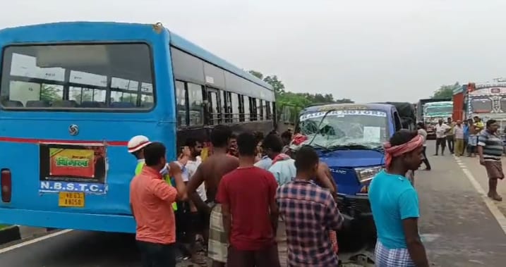মালদা——————- ঘটনাটি ঘটেছে মঙ্গলবার ভোর বেলা । দুর্ঘটনায় বাসের চালক এবং পিকআপ ভ্যানের চালক আহোত। তাদের আশঙ্কাজনক অবস্থায় মালদা মেডিকেল এবং কলেজ হাসপাতালে পাঠানো হয়েছে। জানা গেছে, সরকারি বাসটি গাজোল থেকে মালদা দিকে যাচ্ছিল,ওপরদিকে পিকআপ ভ্যানটি মালদা থেকে গাজোলের দিক থেকে যাচ্ছিল। সেই মূহুর্তে সংঘর্ষে দুর্ঘটনা ঘটে।স্থানীয় বাসিন্দারা তাদের উদ্ধার করে চিকিৎসার জন্য পাঠায় । পুলিশ এবং জাতীয় সড়কের টোলপ্লাজা কর্মীরা ক্রেন এসে গাড়ি উদ্ধার করে।