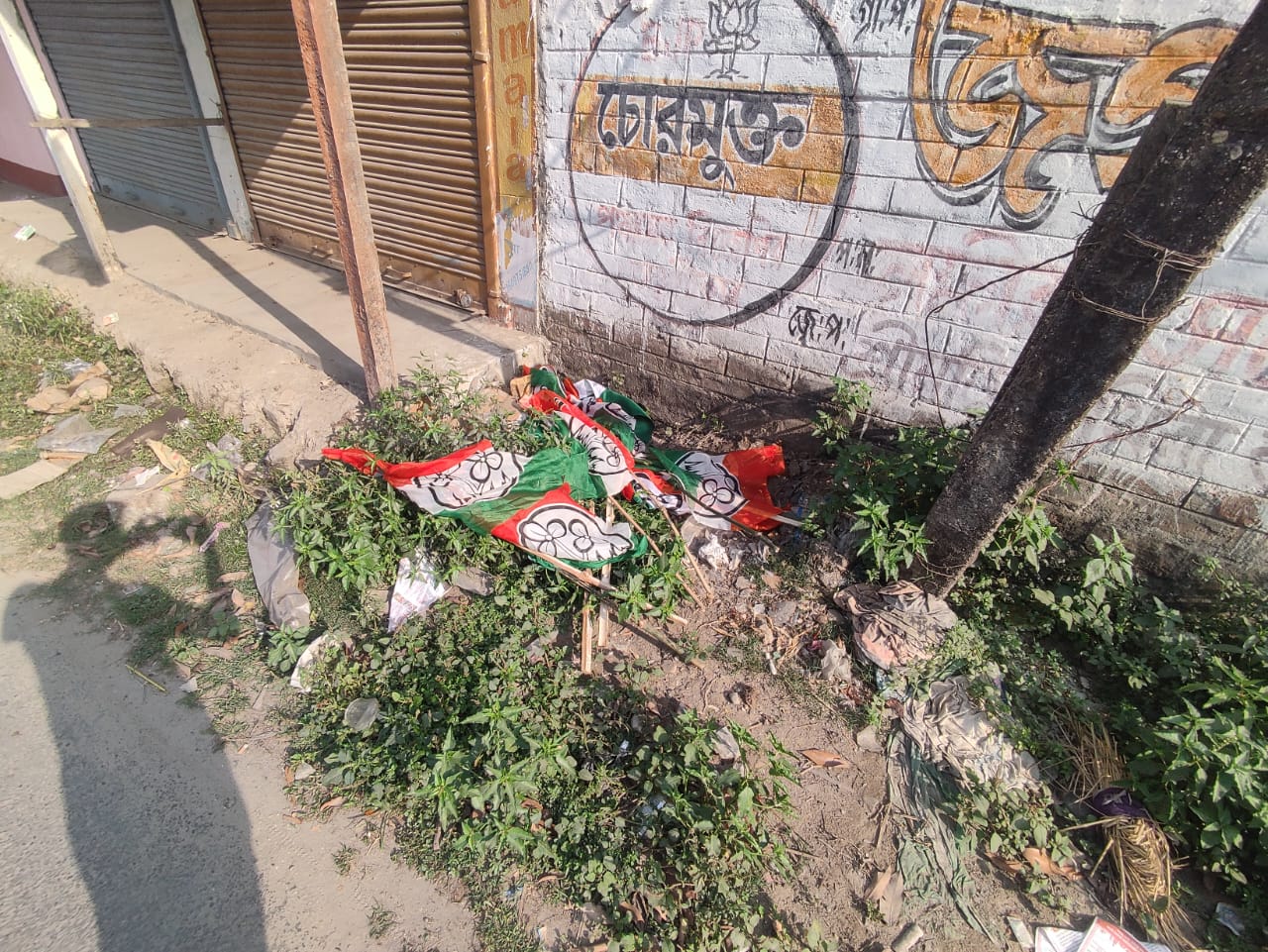 আজ সকালে এই ঘটনাটি ঘটেছে রায়গঞ্জ থানার অন্তর্গত মিরুয়াল এলাকায়। সেখানে আজ সকালে বেশ কিছু দলীয় পতাকা ছিঁড়ে ফেলা হয়। এখানে অভিযোগ উঠেছে দুস্কৃতীদের বিরুদ্ধে। তৃণমূলের অভিযোগ এই দুস্কৃতীরা বিজেপি আশ্রিত। প্রসঙ্গতঃ গতকালই রায়গঞ্জে এসেছেন মুখ্যমন্ত্রী মমতা বন্দোপাধ্যায়। আর এরই মধ্যে এই ঘটনা। তৃণমূল কংগ্রেসের রায়গঞ্জ ব্লক (১) সভাপতি অনিমেষ দেবনাথ বলেন, এই ঘটনা কাম্য নয়। কৃষ্ণ কল্যাণী জিতবে দেখে হতাশায় এই কাজ করেছে বিজেপি