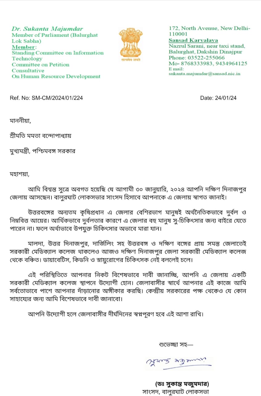 বিজেপি রাজ্য সভাপতি তথা বালুরঘাটের সাংসদ সুকান্ত মজুমদার বলেন, জেলার মানুষের চিকিৎসার স্বার্থে মেডিক্যাল কলেজ প্রয়োজন। যার দাবি নিয়ে এর আগেও একাধিকবার চিঠি দিয়েছেন তিনি। জেলায় আসবার খবর পেয়ে সর্বত্রভাবে সহযোগিতার আশ্বাস দিয়ে আবারও চিঠি দিয়েছেন তিনি।