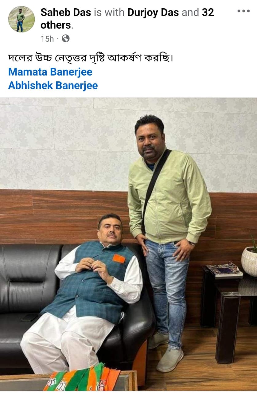 রাজ্যের বিরোধী দলনেতা শুভেন্দু অধিকারীর সঙ্গে তৃণমূলের অঞ্চল সভাপতির ছবিতে ছয়লাপ হল হরিশ্চন্দ্রপুর । ছবির নিচে লেখা হল ‘রাজ্যের গদ্দারের সঙ্গে হরিশ্চন্দ্রপুরের গদ্দার