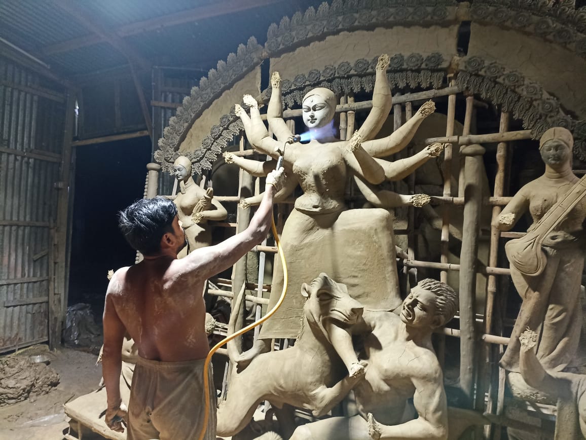 মৃৎ শিল্পী নিখিল পাল আক্ষেপের সুরে বলেন চতুর দিকে ভারি বৃষ্টির ফলে এক তো মাটি নিয়েও সমস্যায় পড়েছি। মাটি থেকে শুরু করে প্রতিমা তৈরীর সরঞ্জাম সবকিছুর দাম অন্য বারের তুলনায় এবার দ্বিগুণ। কয়েক দিন ধরে লাগাতার বৃষ্টির জেরে সুর্যের দেখা নেই। প্রতীমার গায়ে মাটির প্রলেপ শুকাচ্ছে না। তাই হাতে আর বেশি দিন সময় নেই প্রতিমার গায়ে রঙের প্রলেপ দিতে পারছি না। প্রতিমা তৈরীর কাঁচ আদৌ সময় মত হবে কিনা তাই নিয়ে দুশ্চিন্তায় রয়েছেন মৃৎশিল্পীরা এখন পরিবারের সকলে নাওয়া খাওয়া ছেড়ে দিবা রাত্রি অক্লান্ত পরিশ্রম করে ক্লাব গুলোর বরাত নেওয়া প্রতিমার কাজ করে চলতে হচ্ছে।সূর্যের দেখা না পেয়ে বাধ্য হয়ে বার্নার দিয়ে প্রতিমার মাটির প্রলেপ শুকাতে হচ্ছে। কিন্তু এখন পূজা উদ্যোক্তাদের হাতে সময় মতো প্রতিমা তুলে দিতে পারবেন কিনা তা নিয়ে দুশ্চিন্তায় আছেন প্রতিমা শিল্পীরা।