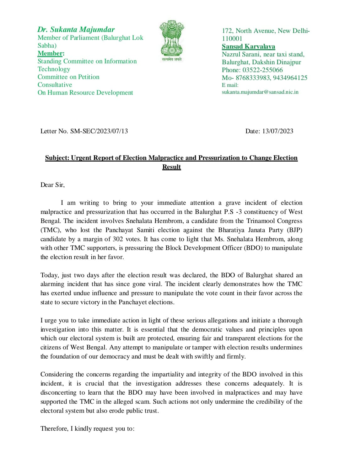 বিজেপি রাজ্য সভাপতি সুকান্ত মজুমদার বলেন, আমাদের জেতা প্রার্থী কে হারানোর চক্রান্ত চলছে। বিডিওর পোস্ট প্রমাণ করেছে গোটা রাজ্যজুড়ে কি চলছে।