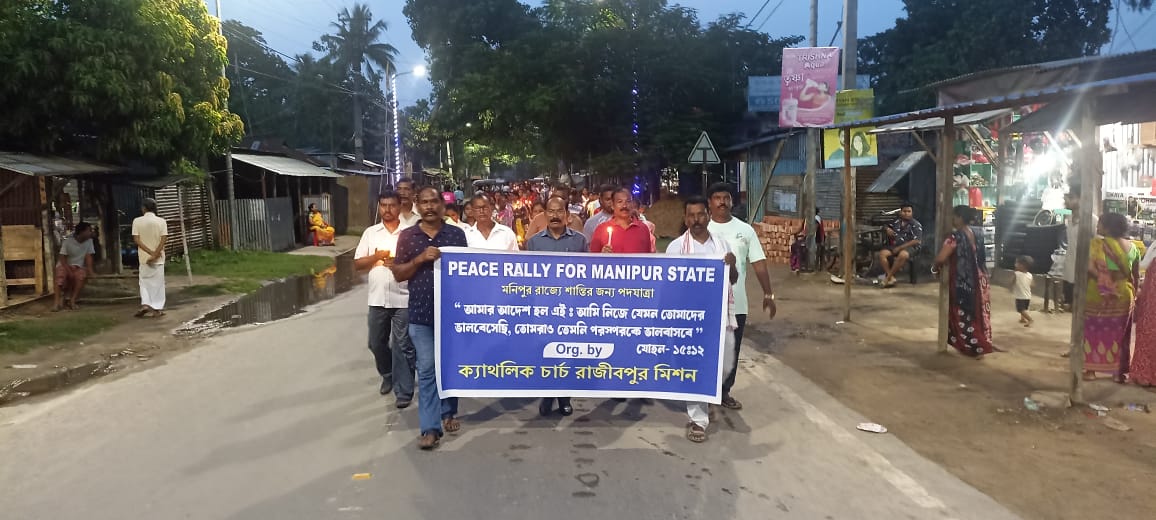 মনিপুর রাজ্যে শান্তির মৌন পথযাত্রা হল গঙ্গারামপুর পৌরসভার ১৮নম্বর ওয়ার্ডে অবস্থিত ক্যাথলিক চার্চ রাজীবপুর মিশনের তরফে,সেখানে প্রায় এক হাজার খ্রিস্টান ধর্মীয় ভক্তরা মিছিলে পা মেলান।