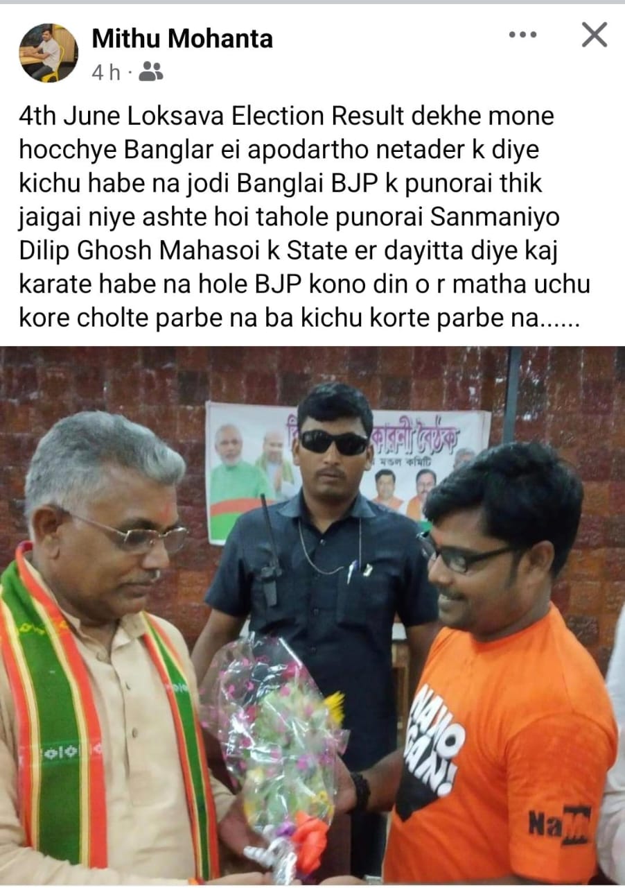 বালুরঘাট, ৬ জুন ——- রাজ্যে হতাশাজনক ফলাফল নিয়ে এবারে সুকান্তর গড় থেকেই উঠলো দিলীপকে ফেরানোর দাবি। বুধবার দিলীপ ঘোষের সাথে নিজের ছবি দিয়ে ফেসবুকে পোস্ট করা এমন একটি পোস্টকে ঘিরেই রীতিমতো চর্চা শুরু হয়েছে খোদ সুকান্তর শহরে। সোশ্যাল মিডিয়াতে পোস্ট করা সেই বিজেপি নেতা মিঠু মহন্তর দাবি, দিলীপ ঘোষ এই রাজ্যে বিজেপিকে শুন্য থেকে ১৮ […]